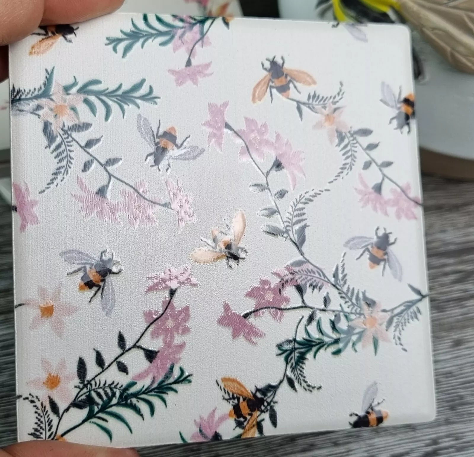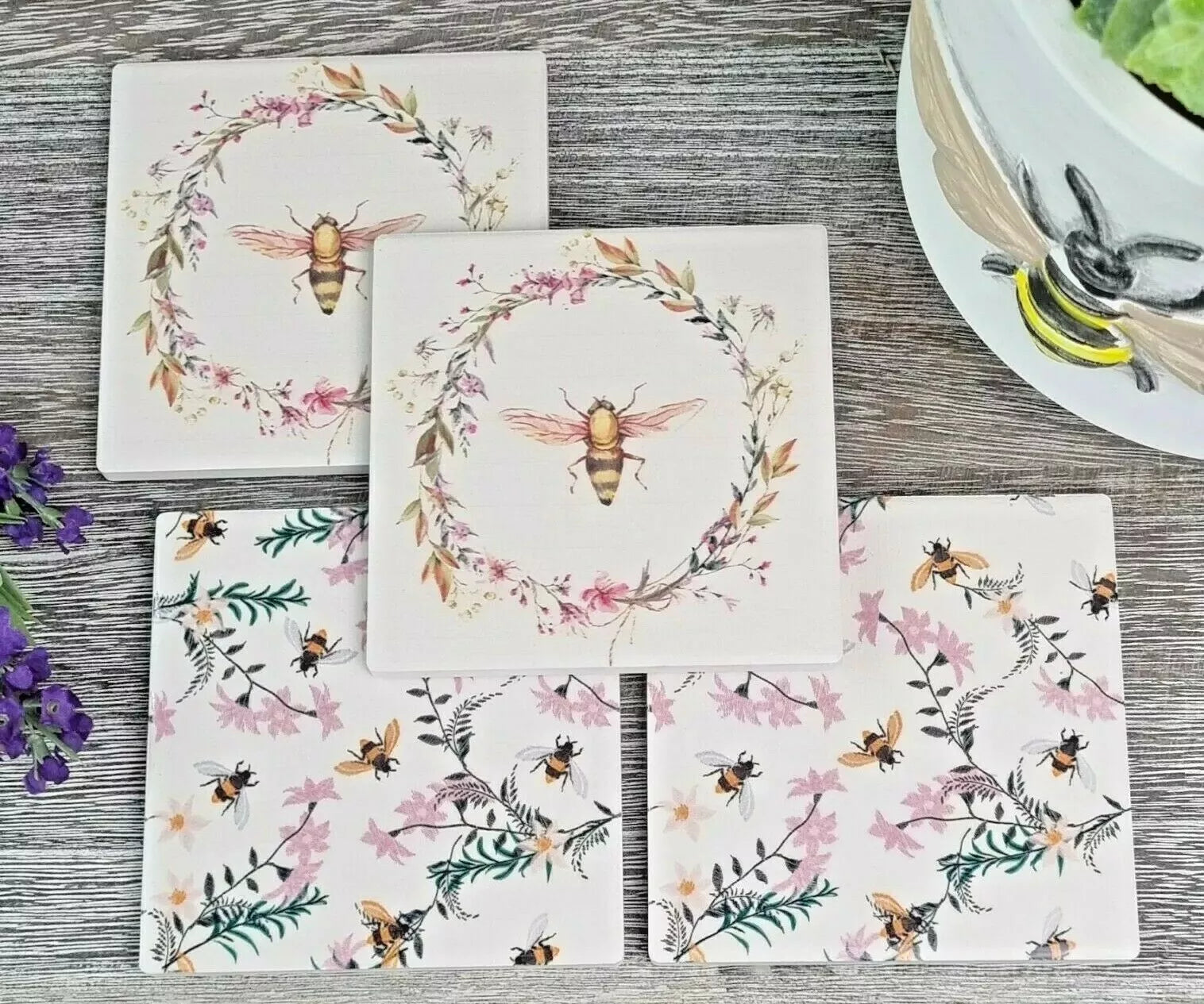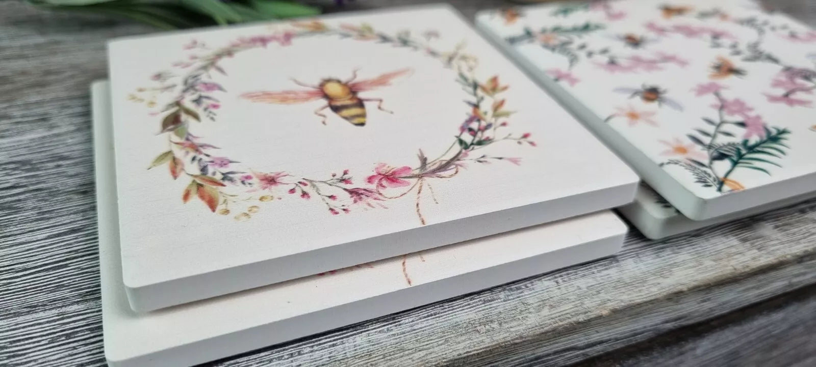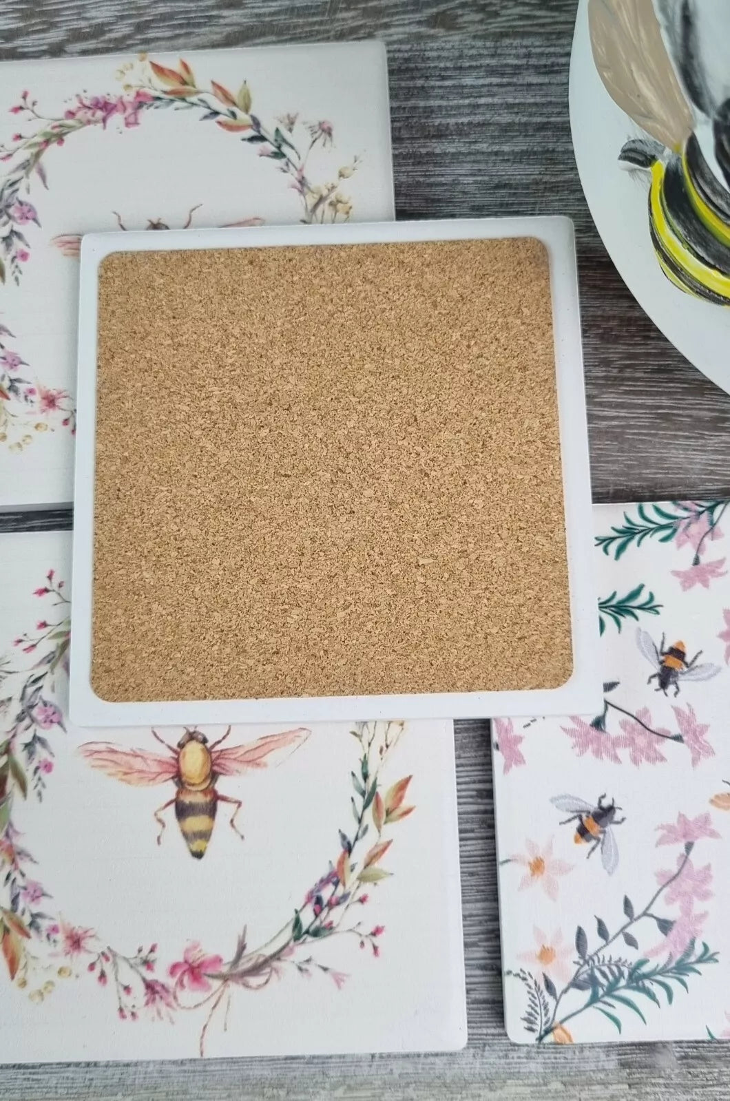 These Coasters featuring a classic and delicate floral pattern, featuring honey bees, are a beautiful way to brighten up your table.