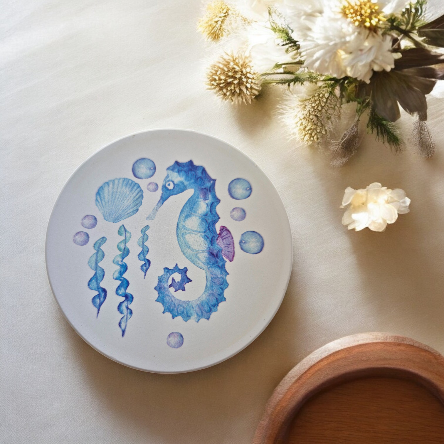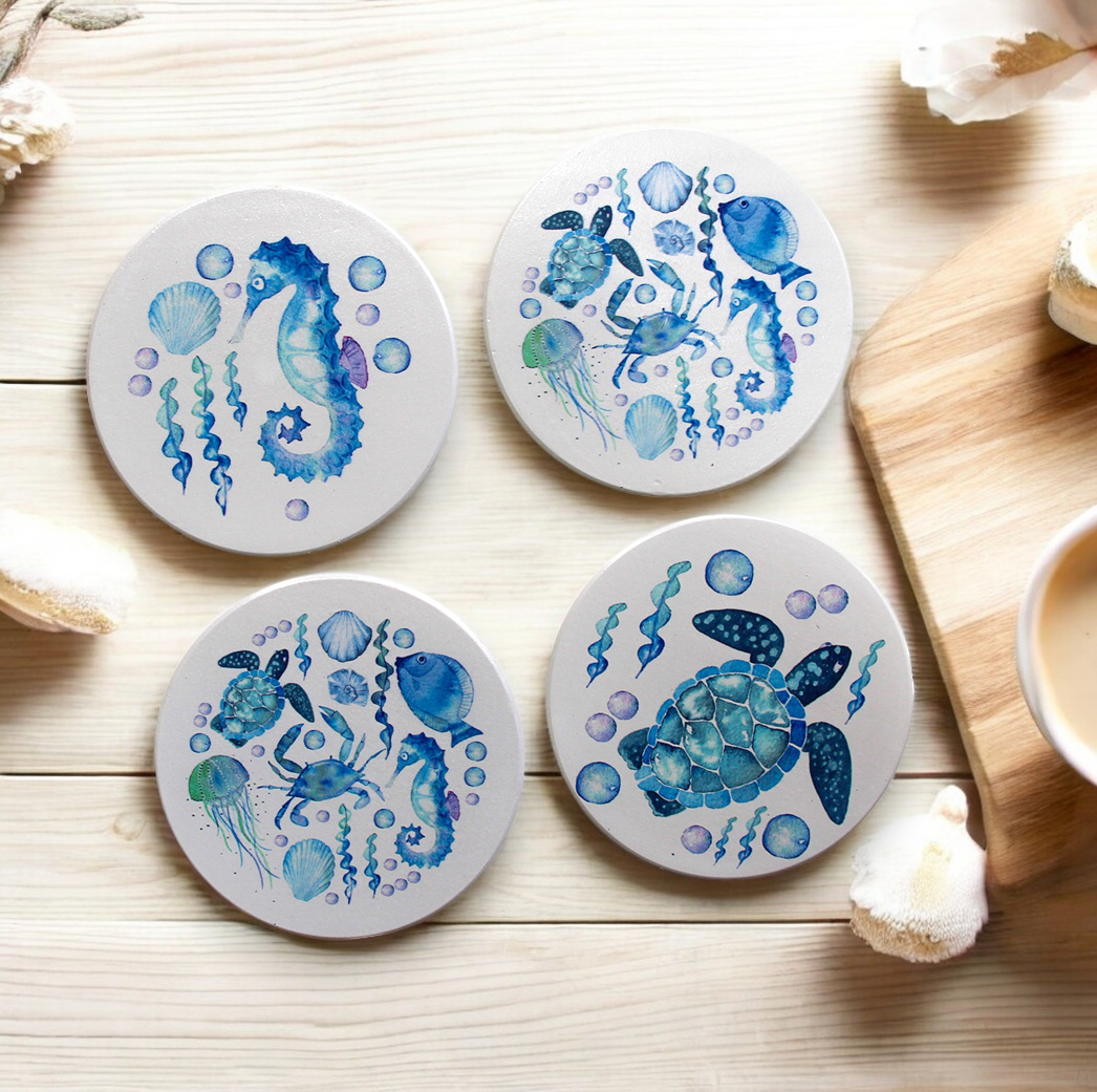 These Coasters featuring a crisp white background with stunning sea blue tones and images of underwater sea life including sea turtle, seahorse, crab, fish, jellyfish, shells and sea plants.