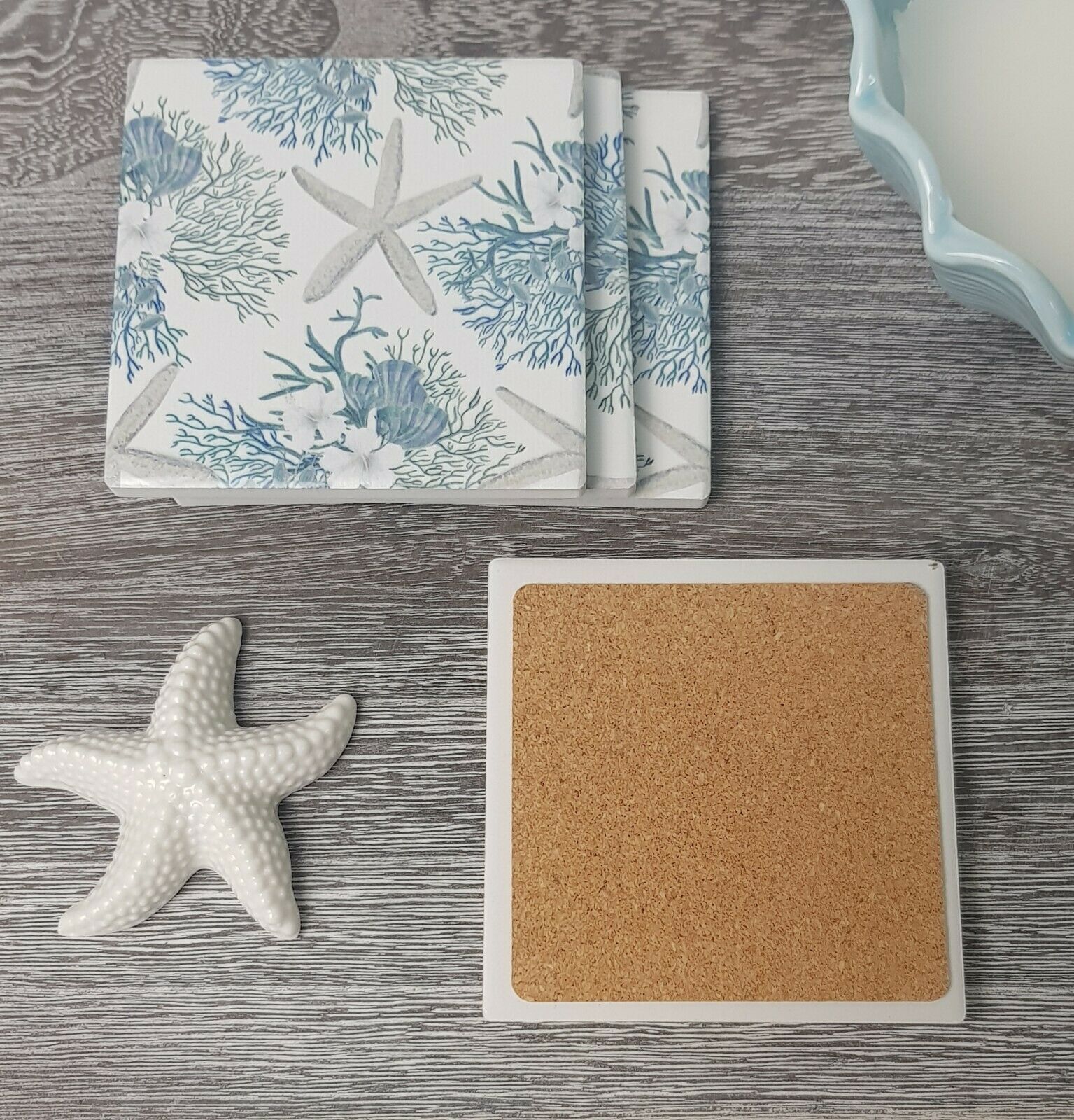 Hamptons Blue & White Starfish Ceramic Tile Coaster Set x 4